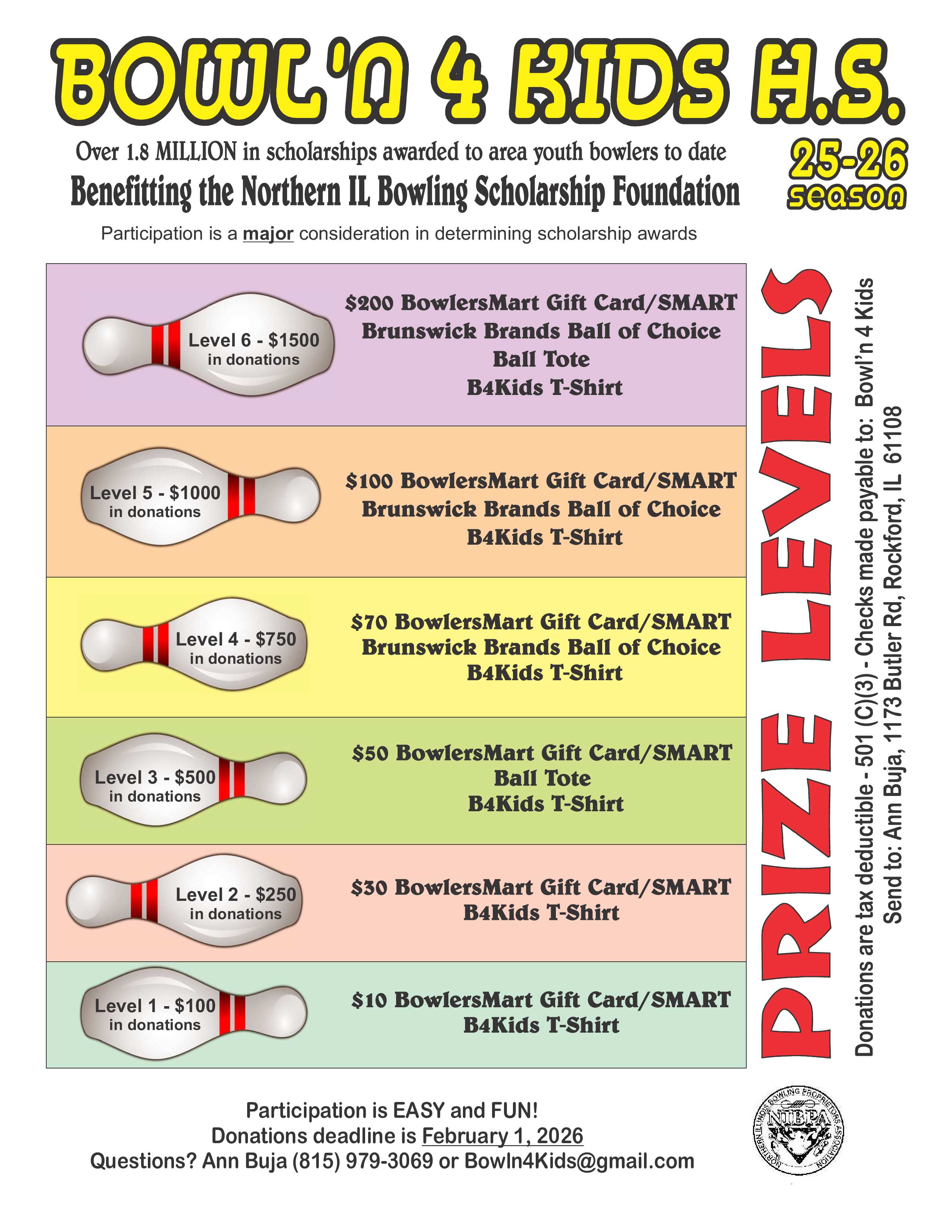 Bowl'n 4 Kids is an annual charity bowling event hosted by the Northern Illinois Bowling Proprietors Association (NIBPA). This event aims to raise funds for local youth bowling scholarships through student participation while providing an opportunity to earn prizes. The Northern Illinois Bowling Proprietors Association Foundation is a nonprofit organization which has supported the bowling industry in the Northern Illinois region since 1993.